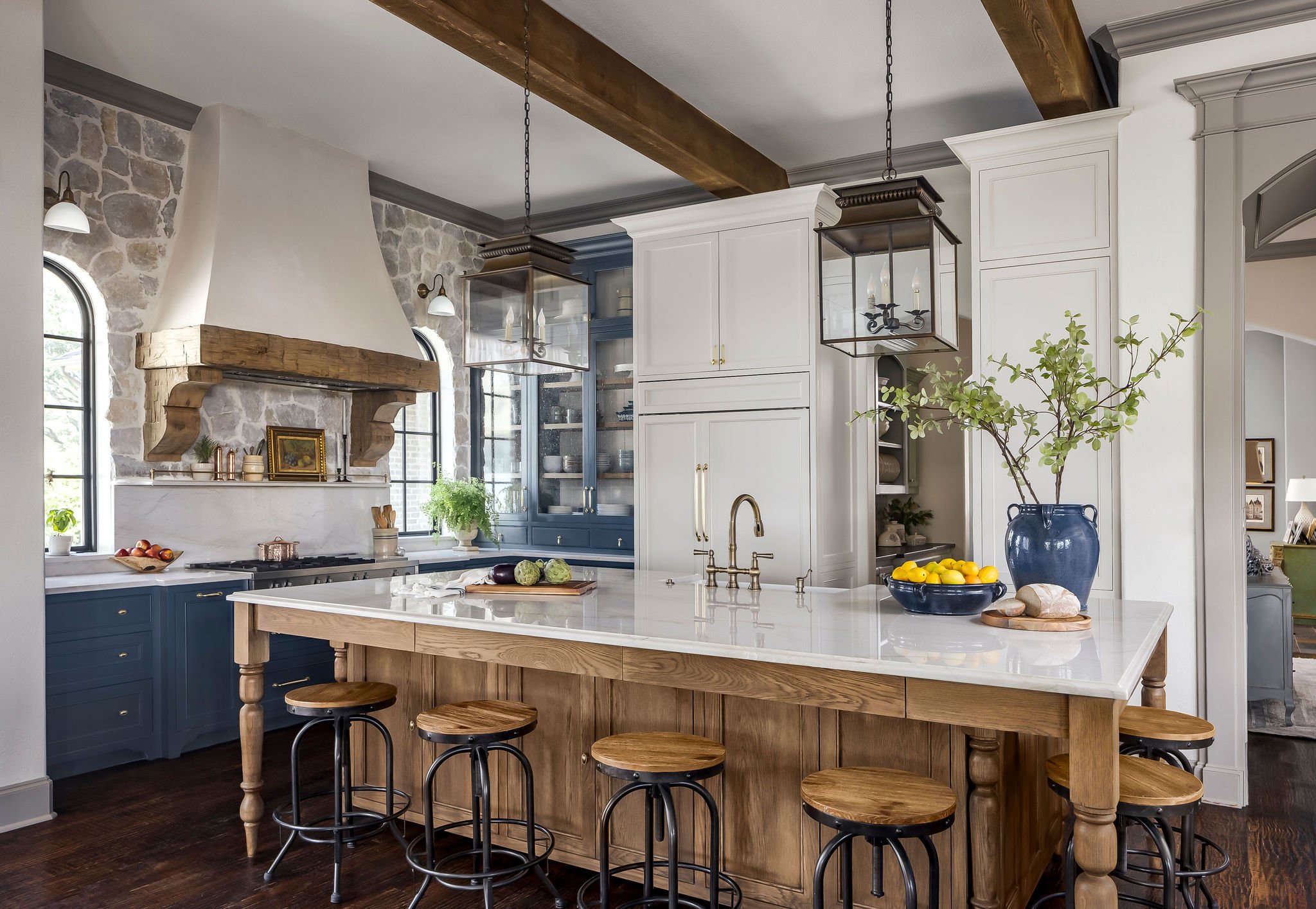 This Old World kitchen features tons of island tons, a great butlers pantry and tons of storage.